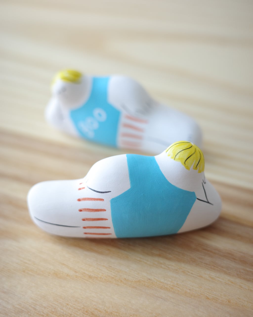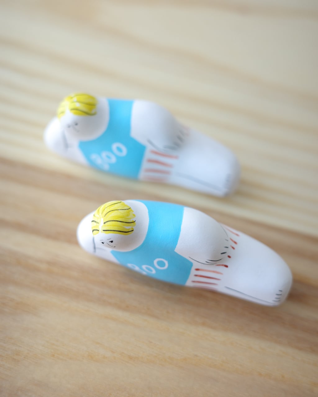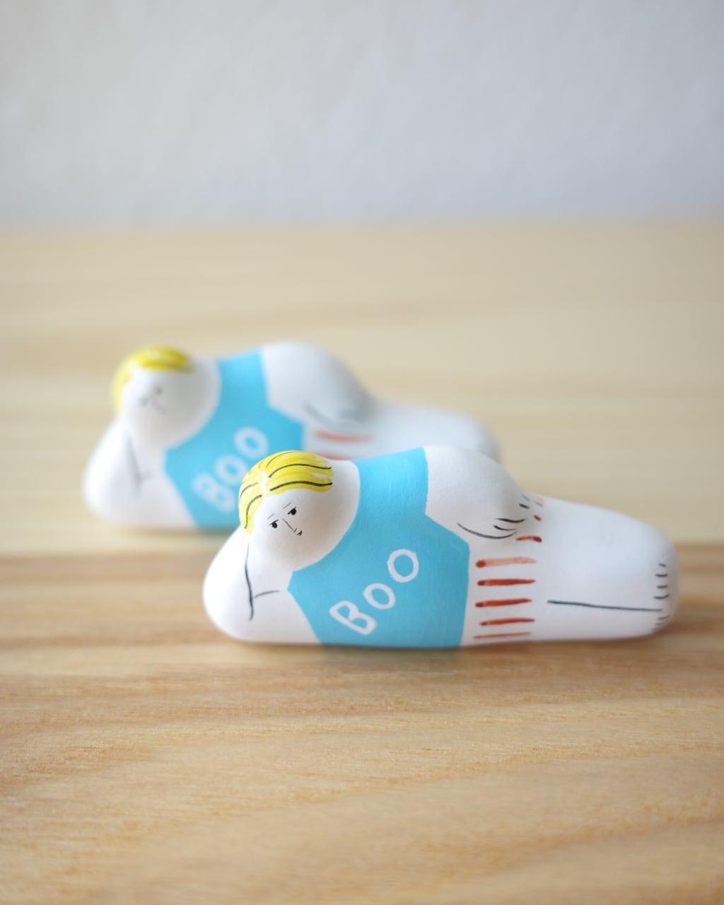 落ち着いた質感と鮮やかな彩色が重なり、ユーモラスでありながらも彫刻のような存在感を放ちます。