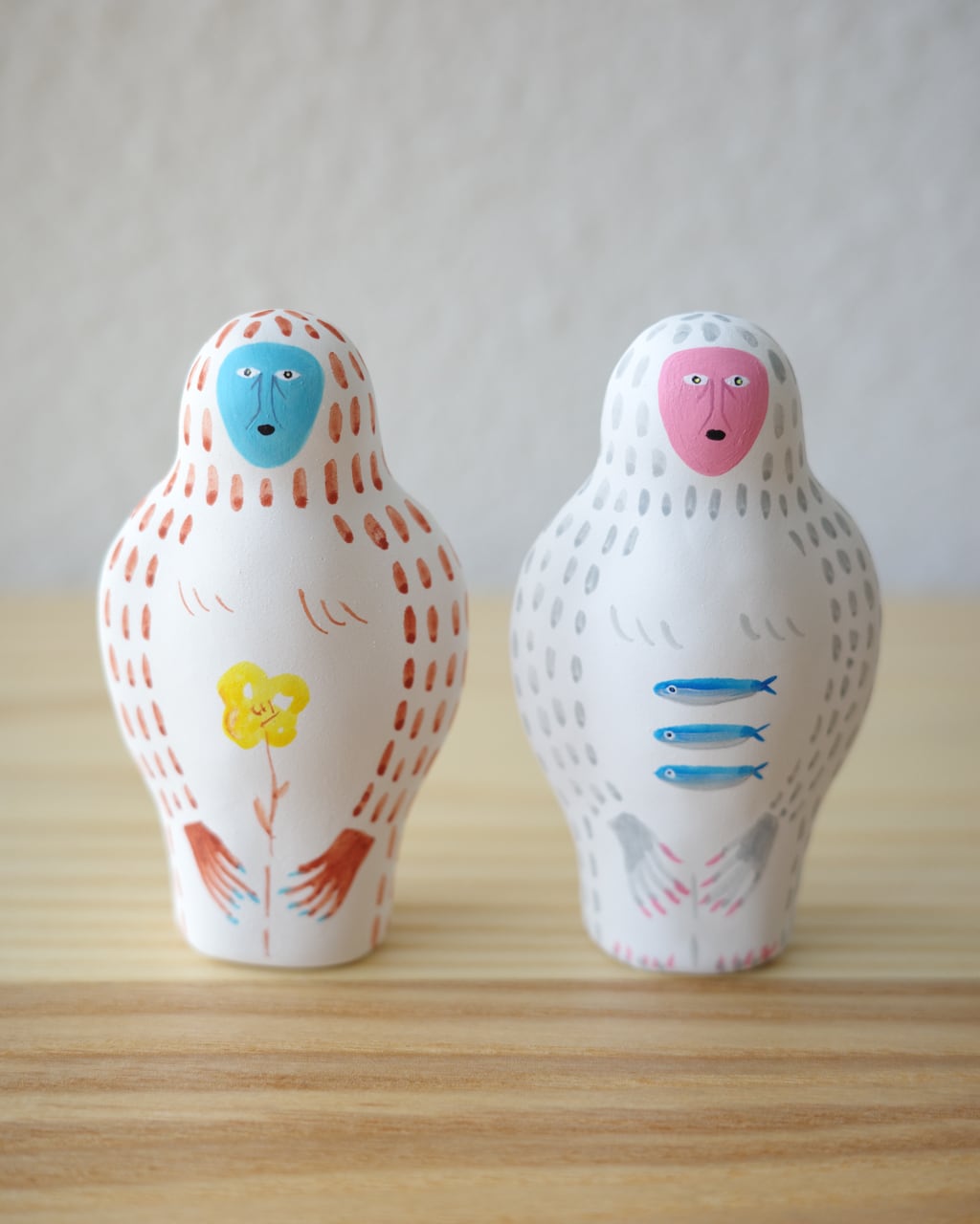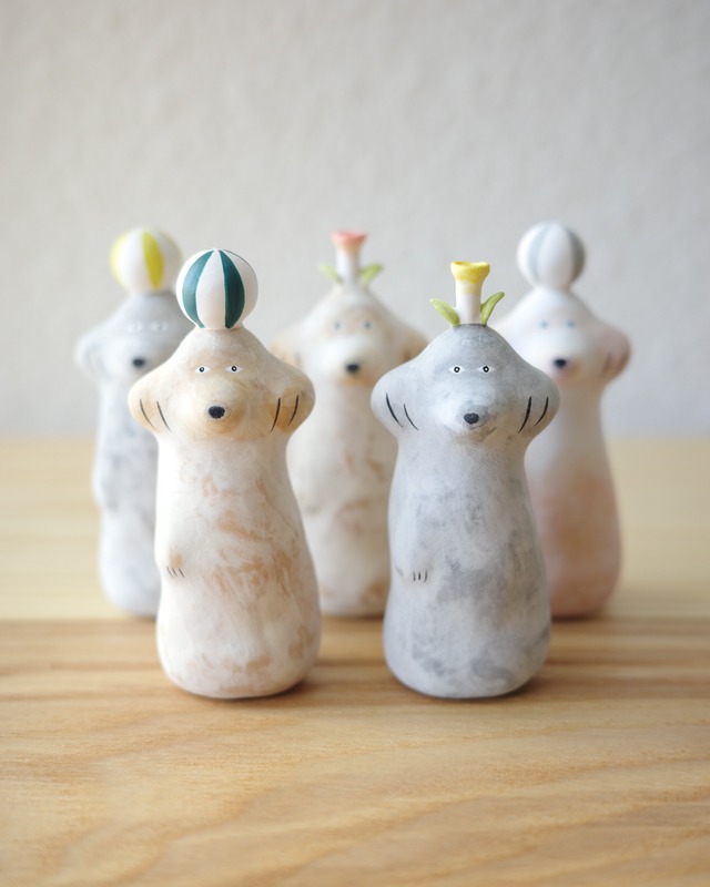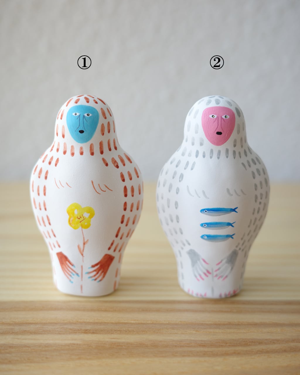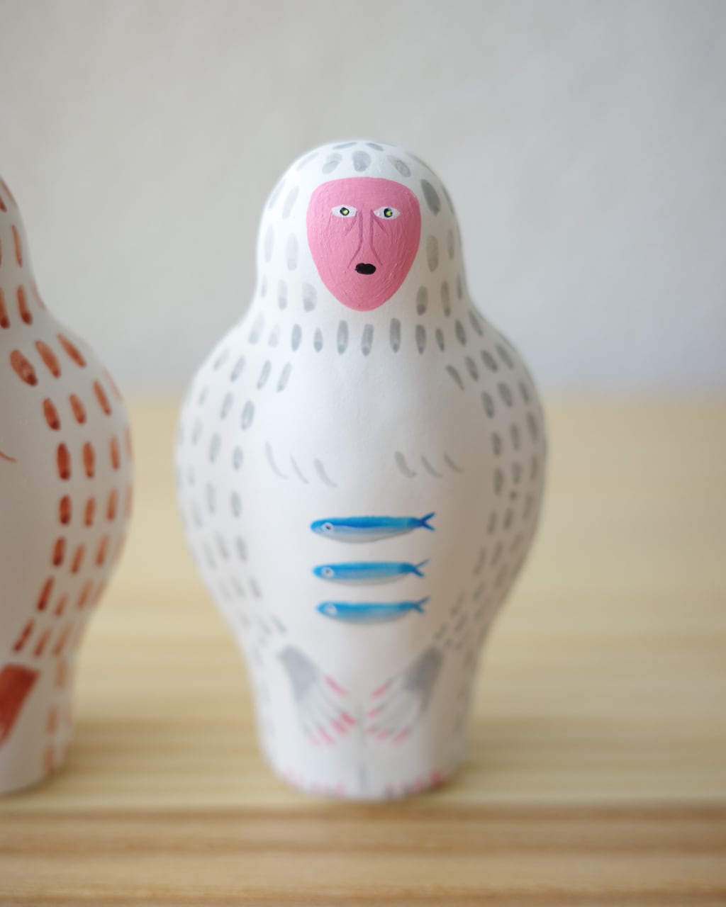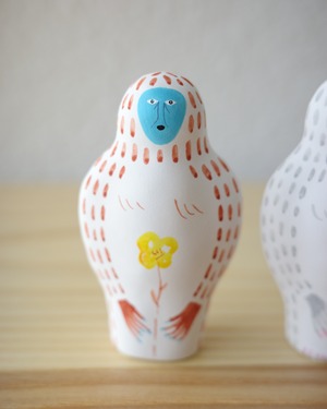 落ち着いた質感と鮮やかな彩色が重なり、ユーモラスでありながらも彫刻のような存在感を放ちます。
