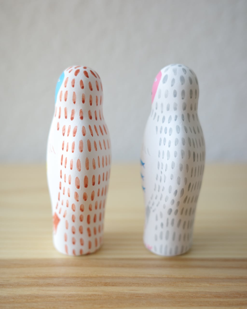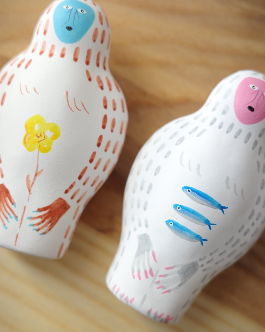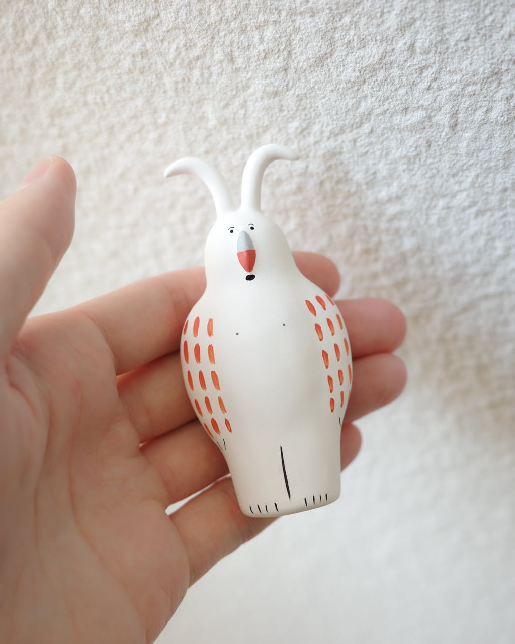 落ち着いた質感と鮮やかな彩色が重なり、ユーモラスでありながらも彫刻のような存在感を放ちます。